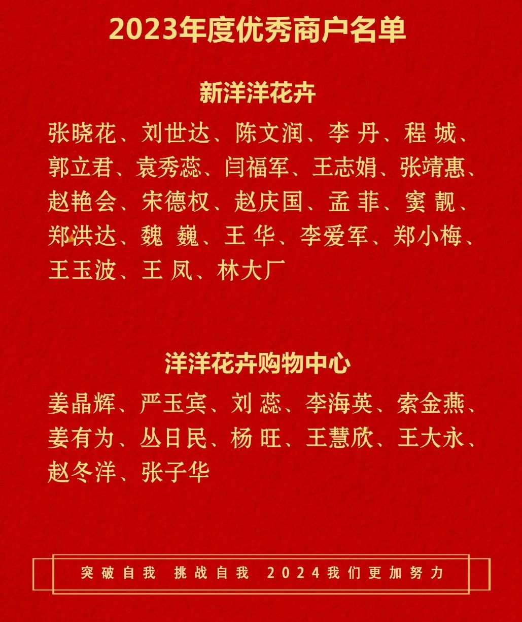 回首過去的一年,我們始終勠力同心、勇毅前行,彰顯出“洋洋”人百折不撓的強大意志與無限潛能。在一次次的市場挑戰(zhàn)與拼搏中,廣大商戶用行動彰顯了誠信與品質(zhì),以身作則維護(hù)市場經(jīng)營秩序,誠信經(jīng)營,承擔(dān)社會責(zé)任,為“洋洋”品牌建設(shè)、市場穩(wěn)定發(fā)展貢獻(xiàn)了力量。會上,集團(tuán)董事局副主席、新洋洋花卉、洋洋花卉購物中心總經(jīng)理劉明宣讀獲獎名單,集團(tuán)董事局副主席啜磊致賀詞。