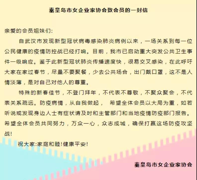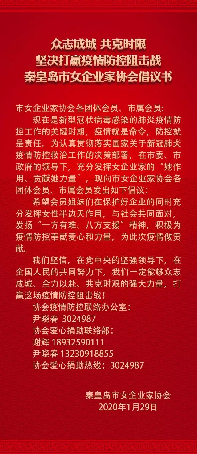 當(dāng)前,新型冠狀病毒感染肺炎疫情的防控工作牽動(dòng)著全國(guó)人民的心,秦皇島市女企業(yè)家協(xié)會(huì)積極響應(yīng)市委、市政府的組織號(hào)召,在市婦聯(lián)的支持下,勇于擔(dān)當(dāng)、積極行動(dòng),為打贏(yíng)這場(chǎng)疫情防控抗擊戰(zhàn)貢獻(xiàn)女企業(yè)家力量。