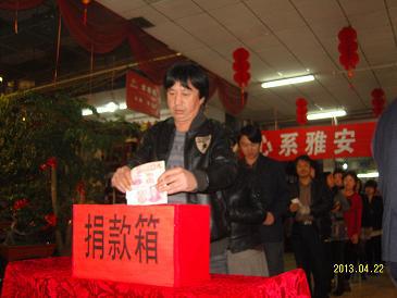 北京時(shí)間2013年4月20日8時(shí)02分,四川省雅安市蘆山縣發(fā)生7.0級(jí)地震,地震災(zāi)害造成山體滑坡、道路塌方、房屋倒塌、人員傷亡,給當(dāng)?shù)厝嗣袢罕娚?cái)產(chǎn)帶來(lái)嚴(yán)重?fù)p失??紤]到災(zāi)區(qū)食品藥品匱乏等實(shí)際狀況,洋洋集團(tuán)高層管理人員第一時(shí)間向秦皇島紅十字協(xié)會(huì)捐贈(zèng),以幫助緩解災(zāi)區(qū)人民的燃眉之急。此外,洋洋集團(tuán)還向全體工作人員及洋洋花卉購(gòu)物中心、洋洋古玩城、新洋洋花卉的經(jīng)營(yíng)商戶發(fā)出倡議,號(hào)召洋洋愛(ài)心大家庭全體成員伸出援助之手,幫助災(zāi)民共渡難關(guān)。