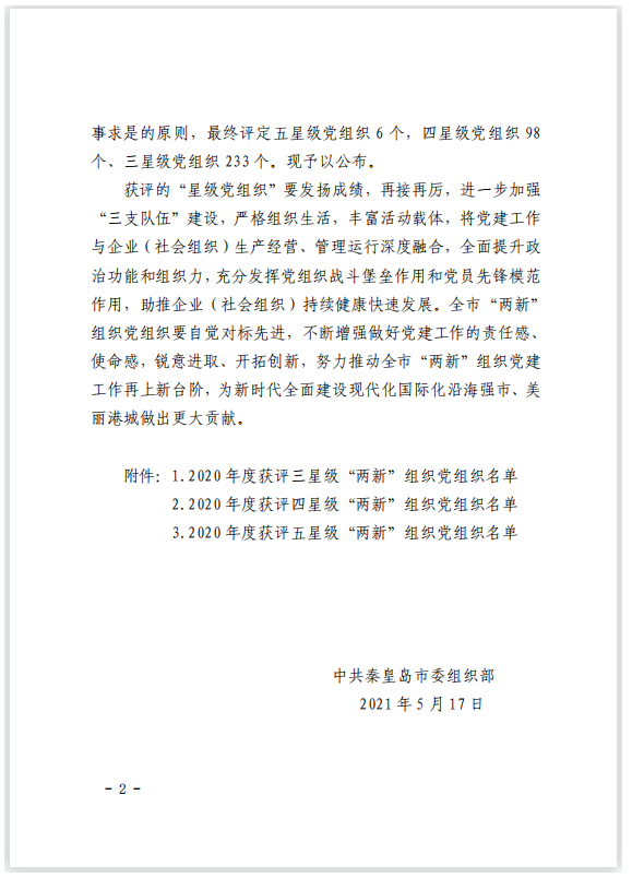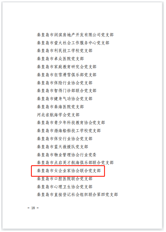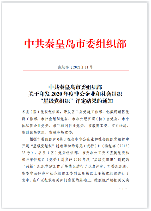 中共秦皇島市委組織部于2021 年 5 月 17 日下發(fā)《關(guān)于印發(fā) 2020 年度非公企業(yè)和社會(huì)組織“星級(jí)黨組織”評(píng)定結(jié)果的通知》,秦皇島市女企業(yè)家協(xié)會(huì)聯(lián)合黨支部榮獲市委組織部、市委非公經(jīng)濟(jì)和社會(huì)組織工委授予的“四星級(jí)黨組織”榮譽(yù)稱號(hào),這是協(xié)會(huì)聯(lián)合黨支部自2018年以來(lái),連續(xù)3年獲此殊榮。秦皇島市女企業(yè)家協(xié)會(huì)聯(lián)合黨支部將積極發(fā)揮作用,讓黨支部的思想建設(shè)、組織建設(shè)、作風(fēng)建設(shè)與支部工作深度融合,全面提升支部的政治功能和組織力,充分發(fā)揮黨組織戰(zhàn)斗堡壘作用和黨員先鋒模范作用,與時(shí)俱進(jìn)、開(kāi)拓創(chuàng)新,以黨建帶會(huì)建助推協(xié)會(huì)持續(xù)健康快速發(fā)展,用優(yōu)異的成績(jī)慶祝建黨100周年!