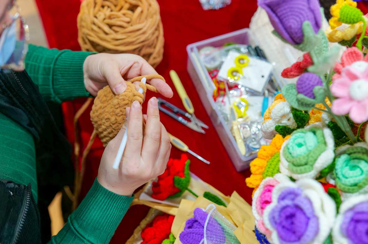 在河北省秦皇島市海港區(qū)洋洋花卉市場,店主正在手工編織花束。