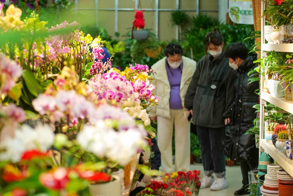 市民在河北省秦皇島市海港區(qū)洋洋花卉市場選購鮮花。
