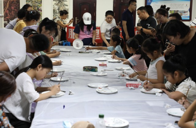 秦皇島市古玩收藏商會書畫專業(yè)委員會的資深書法家為孩子們介紹了展區(qū)內的文玩瓷器及瓷器的發(fā)展歷史,讓大家能夠近距離感受到傳統(tǒng)文化的魅力。隨后,在書法家的指導下孩子們紛紛開始瓷器彩繪體驗,他們揮動著手中的畫筆,丹青描繪,妙筆生花。一個個普普通通的白色陶器,經過孩子們富有想象力的勾勒和填色,變成了五彩斑斕、獨一無二的作品。